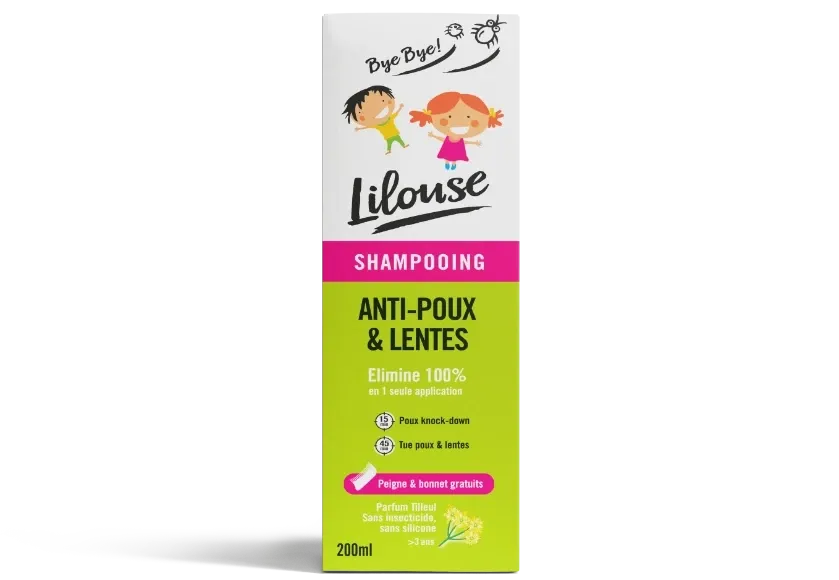 Lilouse Shampooing élimine 100 % des poux et des lentes en un seul traitement. Sa formule naturelle à base d'huile de coco asphyxie les poux et les lentes en bloquant leurs voies respiratoires et facilite le peignage. Convient aux enfants dès l'âge de 3 ans, sans insecticides ni silicones, avec un agréable parfum de tilleul. Lilouse Shampooing est un dispositif médical de classe I.